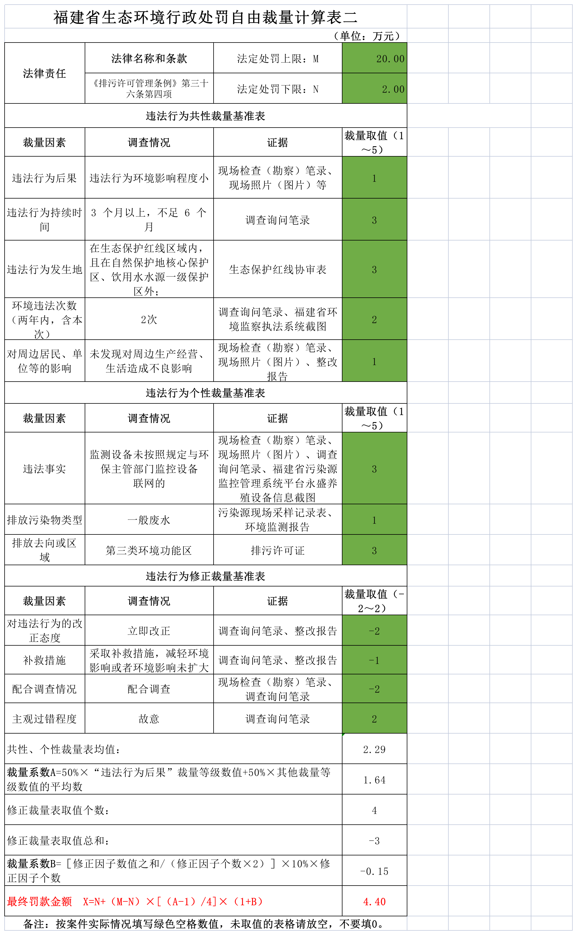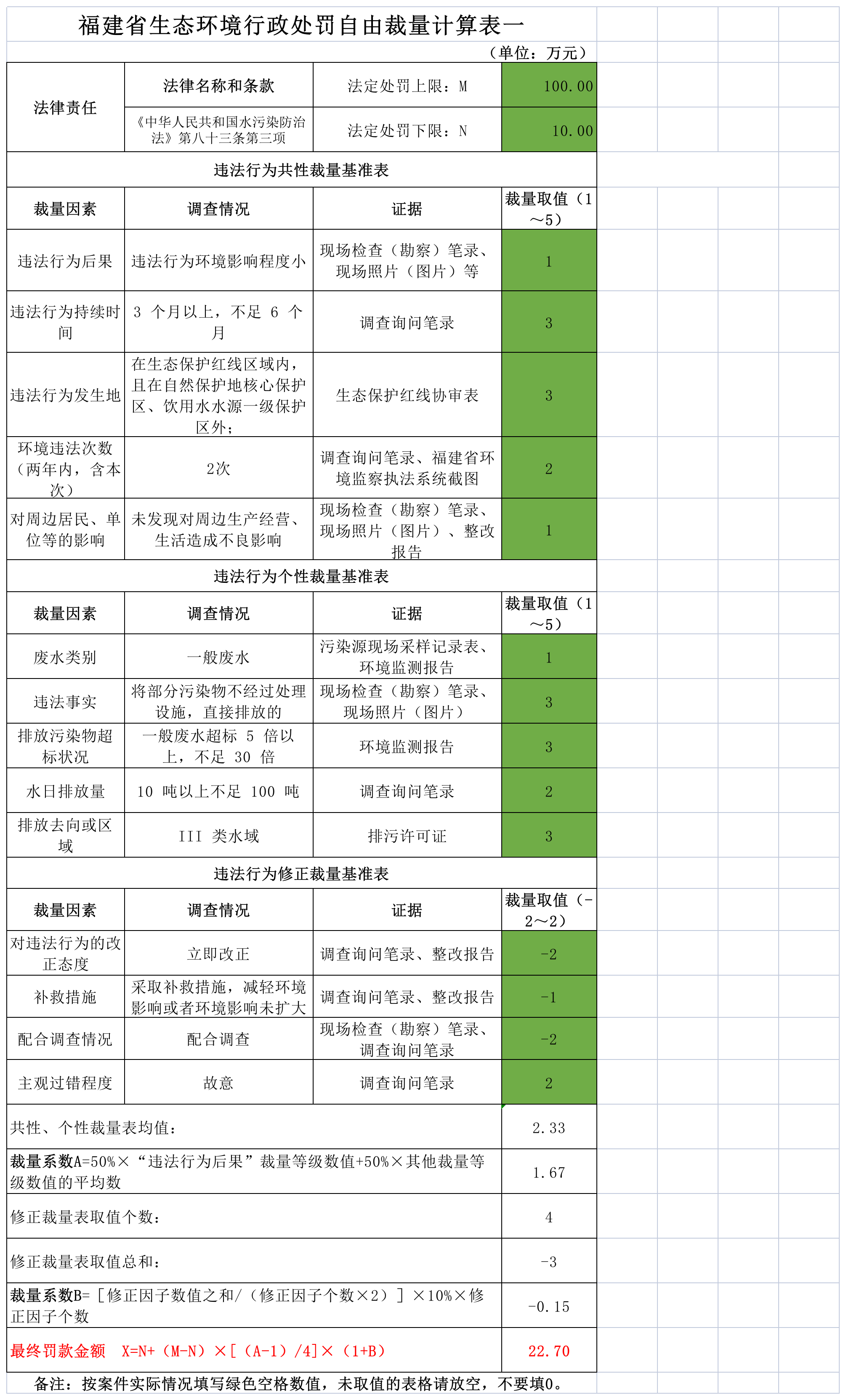 附件:福建省生态环境行政处罚自由裁量计算表一、二